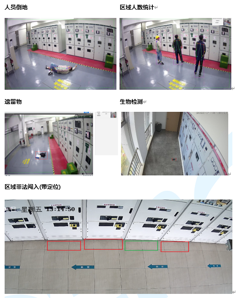 l   支持危险区域非法闯入、警戒线、人员倒地、固定区域人数统计、带点间隔人员入侵定位功能;